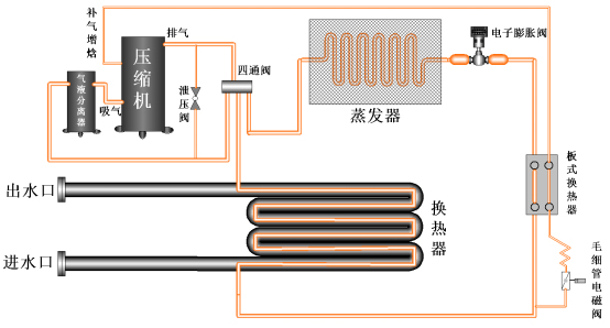 When the four-way valve reverses, the high-temperature and high-pressure refrigerant gas discharged from the compressor enters the evaporator, where it releases heat and becomes liquid. After throttling and depressurizing by expansion valve, the temperature of liquid refrigerant decreases sharply, and the heat in the water is absorbed in the heat exchanger. Through this process, the water is cooled and the refrigeration function is realized.