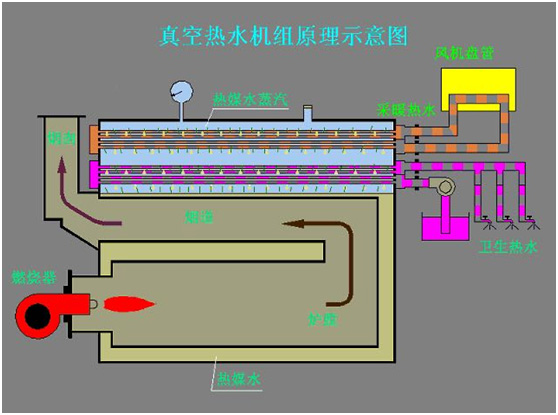 The whole structure of the natural gas vacuum phase change boiler is a negative pressure hot water unit. The unit is equipped with burner and a smoke pipe. The unit uses natural gas to burn in the furnace through a burner, and the heat generated by the combustion heats the heat medium water. The air inside has been vacuum out before commissioning, and the machine is in a vacuum status. The heat medium water is heated to about 30℃ and then evaporate in a vacuum state. The steam heat the hot water flowing in the heat transfer tube to provide it to the outside world hot water or sanitary hot water or for heating.