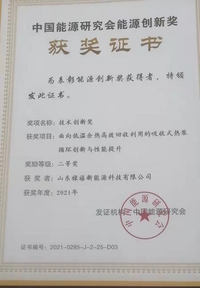 China Energy Research Society is one of the most influential academic groups in China's energy field. The energy innovation award has been actively responded to and recognized by many people in the energy industry, and has developed into a important award in energy innovation field. China Energy Research Society announced the list of energy innovation awards of China Energy Research Association in 2021. Shandong Lucy New Energy Technology Co., Ltd. and Shanghai Jiao Tong University won the second prize of Technological Innovation Award for the cooperation project "Innovation and performance improvement of absorption heat pump cycle for efficient recovery and utilization of low-temperature waste heat". The project has been unanimously recognized by industry experts and industry insiders.