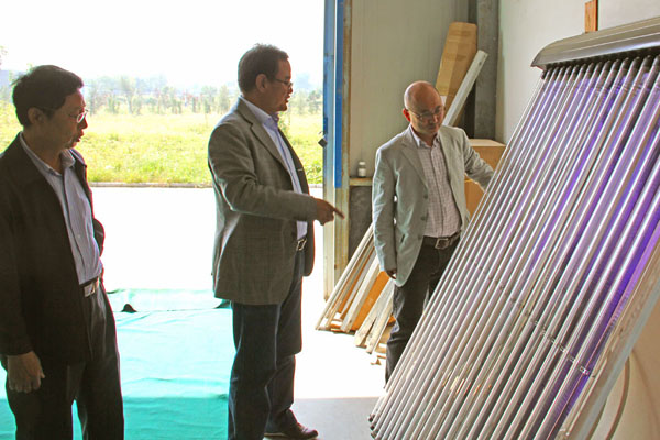 鲁总来到我院太阳能研究所——禄禧新能源,参观了高温太阳能真空集热管生产车间,金德禄董事长向客人详细介绍了高温太阳能真空集热管的研发和生产情况及太阳能空调、生物质真空锅炉等其他新能源设备的厂房规划和扩建情况。