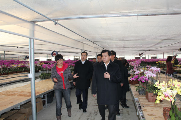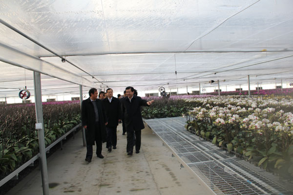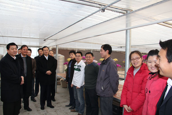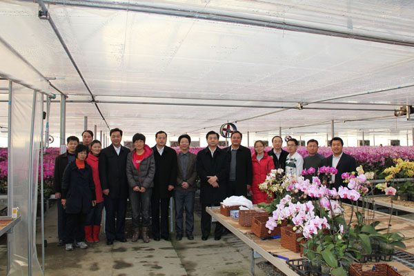 In the morning ofJanuary 7th, the sun is shining brightly. several hundred thousand of moth orchid flowers cheered up in orchid storehouse of Qingzhou Flower Research Institute. Young teachers and employees of Our college are working hard. Mayor Xu Liquan visited Qingzhou Flower Research Institute, accompanied by Chairman Jin and Deputy Mayor Han Xingfu of Qingzhou.