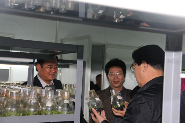 Mayor Xu visited the Orchid storehouse and listened to the introduction and report on the sport. He fully affirmed our innovation development mode and initial achievements gained in establishment research institutions of flower industry with Taiwan enterprises and local government. In the flower sales office, young teachers gave an account to Mayor Xu of their graduated universities, profession, and working experience in the college. Mayor Xu said our young teachers met a good time, a good working platform and a good boss. He stressed young teachers with formidable knowledge; excellent practice ability will make great achievements by hard working. He visited the office building and had a detailed understanding of work processes of tissue culture lab, encouraging scientific research staff to make bold changes and innovations so as to gain better results in breeding new varieties. In terms of our college development, he pointed out we have more important responsibility for developing undergraduate and vocation education of Weifang in the future.