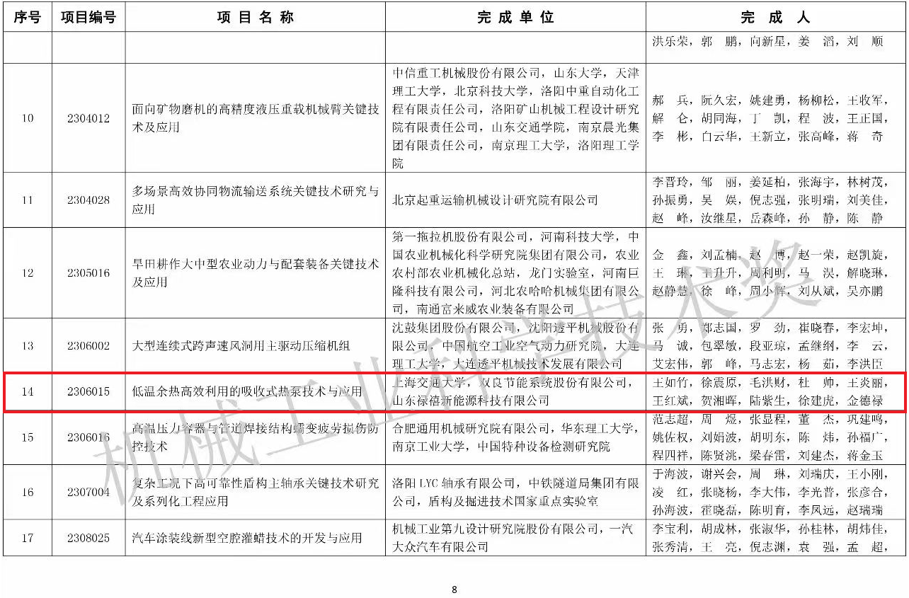 日前,中国机械工业联合会和中国机械工程学会联合发布了《关于表彰2023年度“机械工业科学技术奖”奖励项目的通报》,由上海交通大学王如竹教授牵头,山东禄禧新能源科技有限公司作为共同完成单位的“低温余热高效利用的吸收式热泵技术与应用”项目获科技进步奖一等奖。