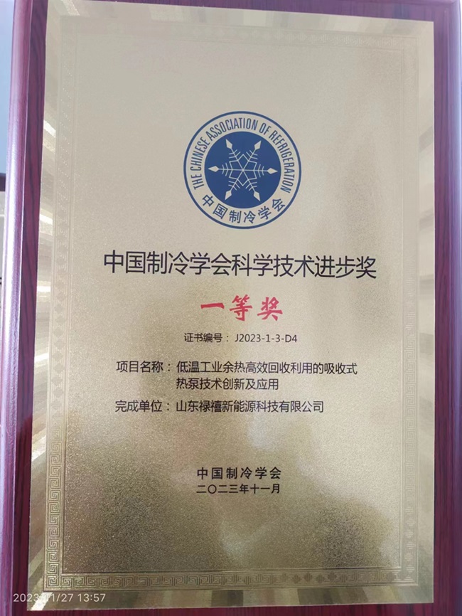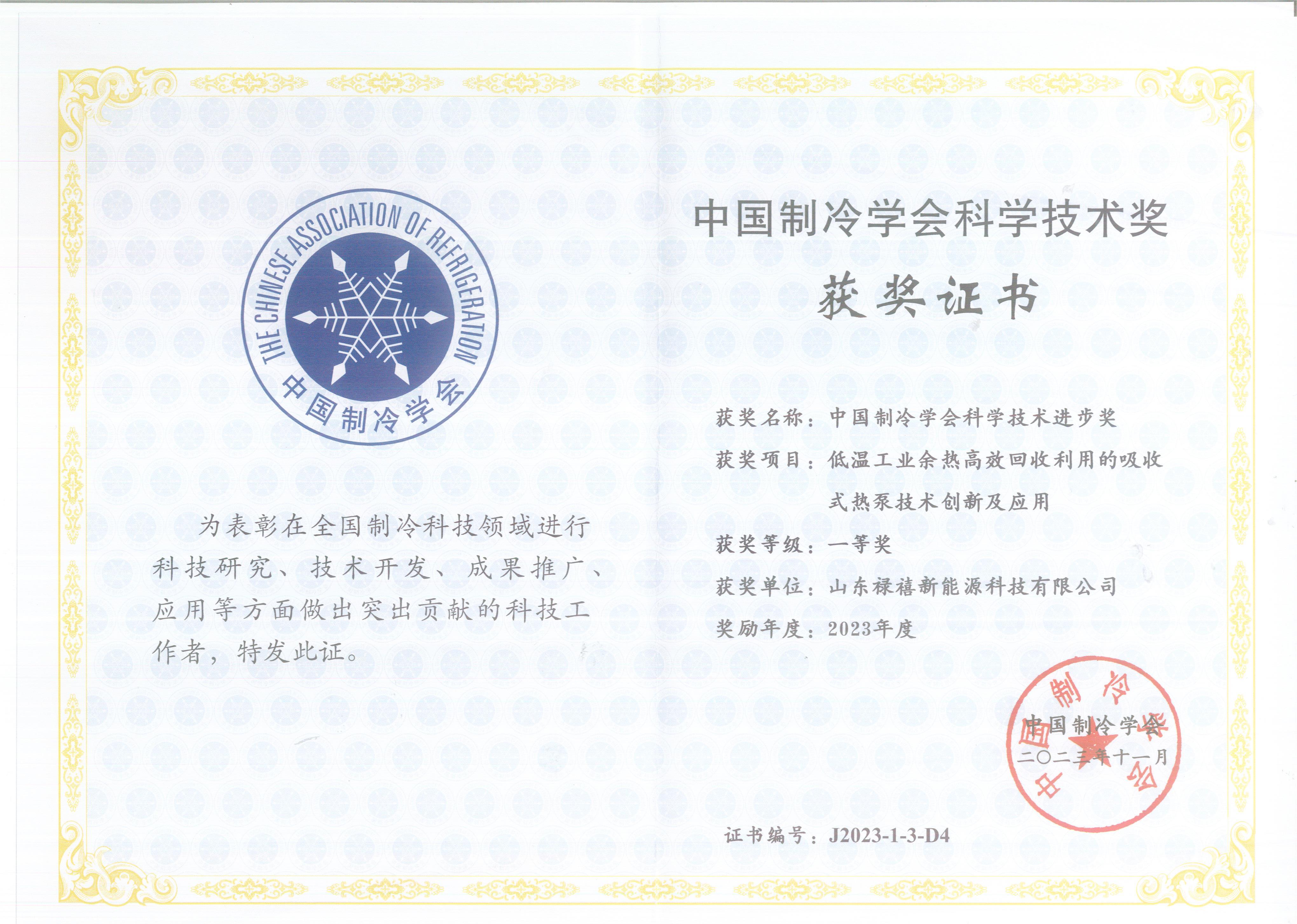 中国制冷学会科学技术进步奖旨在表彰在全国制冷科技领域作出突出贡献的,在推动行业科学技术进步等方面有重大贡献单位与个人。这次获得一等奖是对禄禧新能源在低温余热回收利用技术创新和产品突破成绩的肯定。